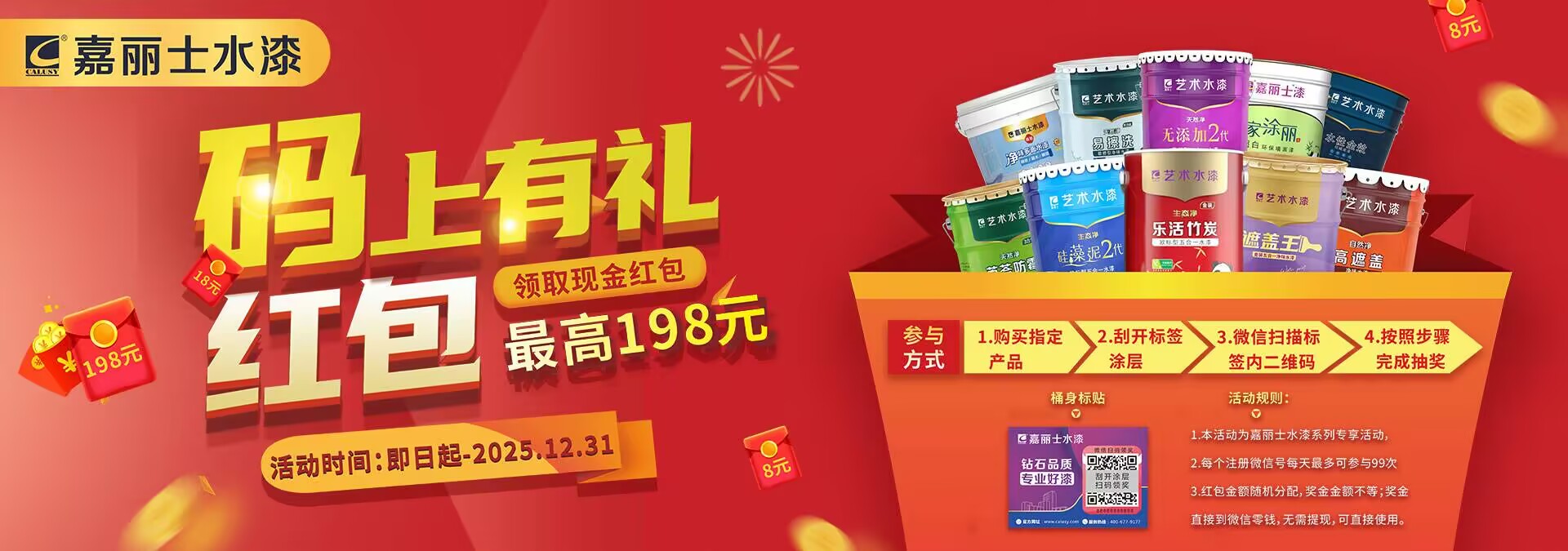 嘉麗士水漆 推出 “碼上有禮” 紅包活動(dòng),最高可領(lǐng)198元!不管是1.8 元、5.8元,38元,還是超級幸運(yùn)的198 元,每一個(gè)紅包都是嘉麗士水漆對大家的誠意與回饋。