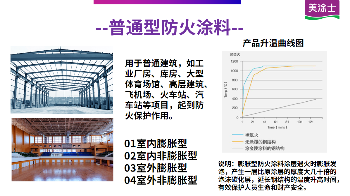 由丙烯酸樹脂、三聚氰胺、季戊四醇、聚磷酸銨、溶劑、助劑等組成,遇火災時能膨脹發(fā)泡炭化,形成不易燃燒的致密海綿狀炭質(zhì)層,阻滯熱量向基材傳播,提高鋼結(jié)構(gòu)的耐火時間,有效保護鋼結(jié)構(gòu)建筑免受火災侵害。