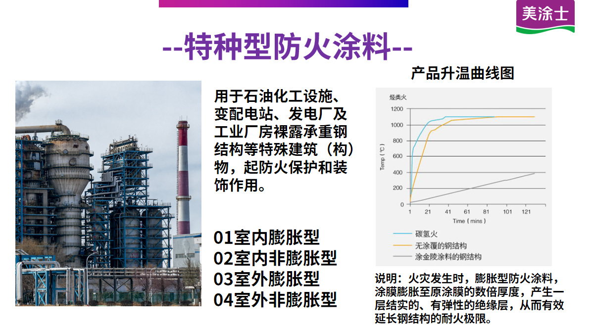 適用特殊建筑物(如石油化工設備、變配電站等)室外鋼結(jié)構(gòu)表面的防火保護。